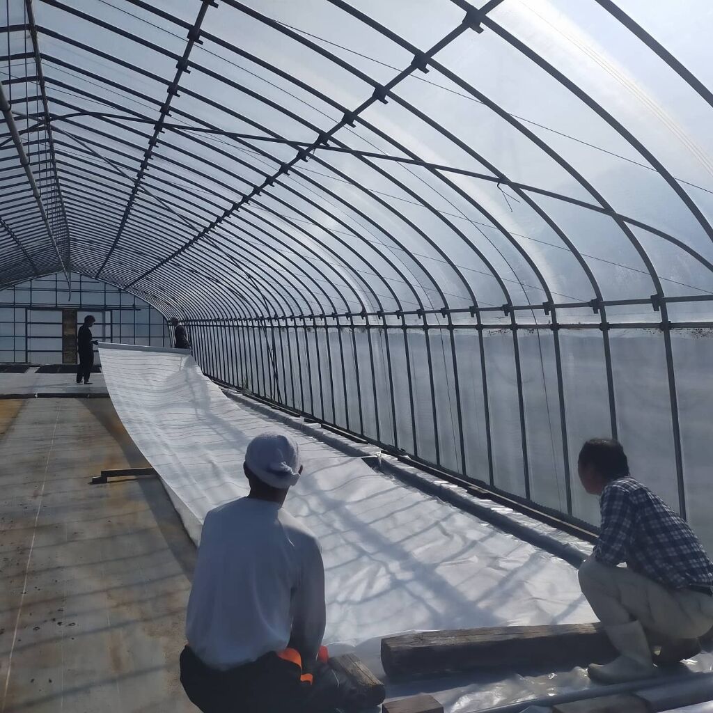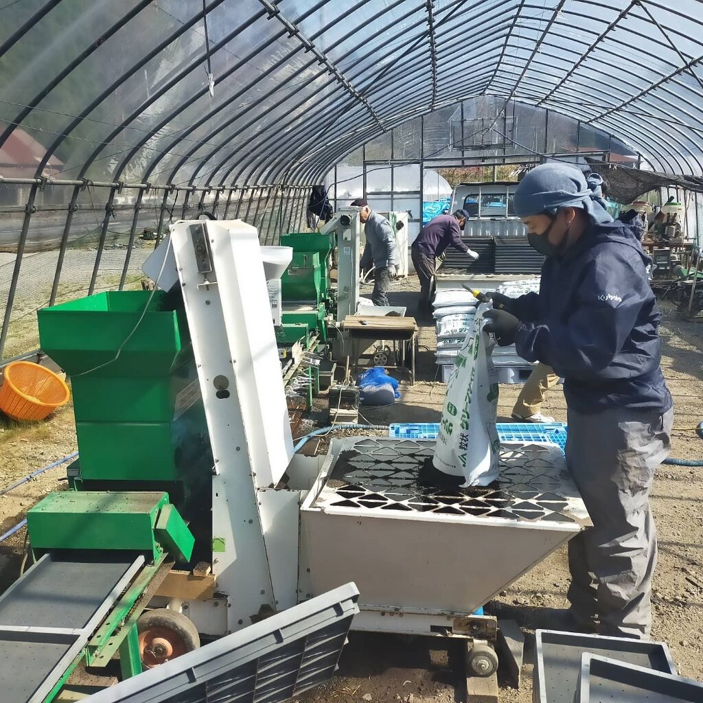 苗箱を作りビニールハウス内に並べていく作業を