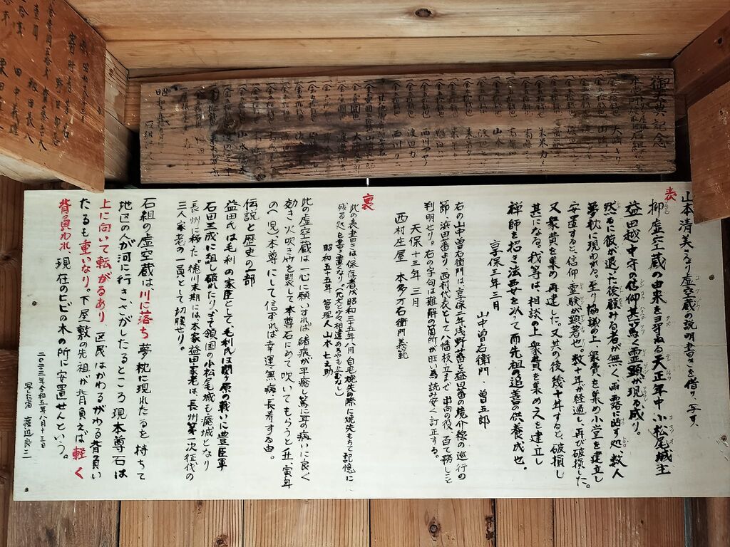 近くに住む山本家は長い間、虚空蔵のお世話をされてこられ、虚空蔵のいわれをお持ちだったのですが、火事で焼失。記憶を頼りにまとめられていた書をこのたび、石組出身の渡辺良三さんが、子どもたちでも読めるようにと、当用漢字を使ったりフリガナを使ったりして、板に写しました。