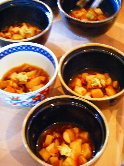 野菜などを煮込んで、特産のわさびを乗せて…。