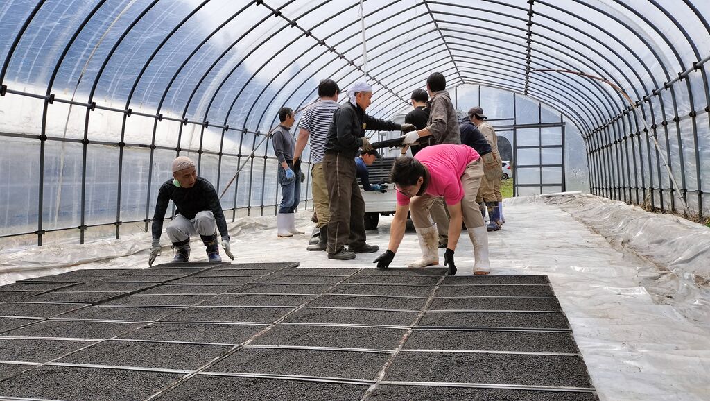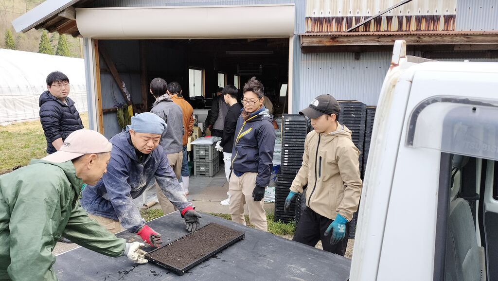 下道川地区営農組合さんからの要請で、稲の苗箱運搬作業に参加しました。