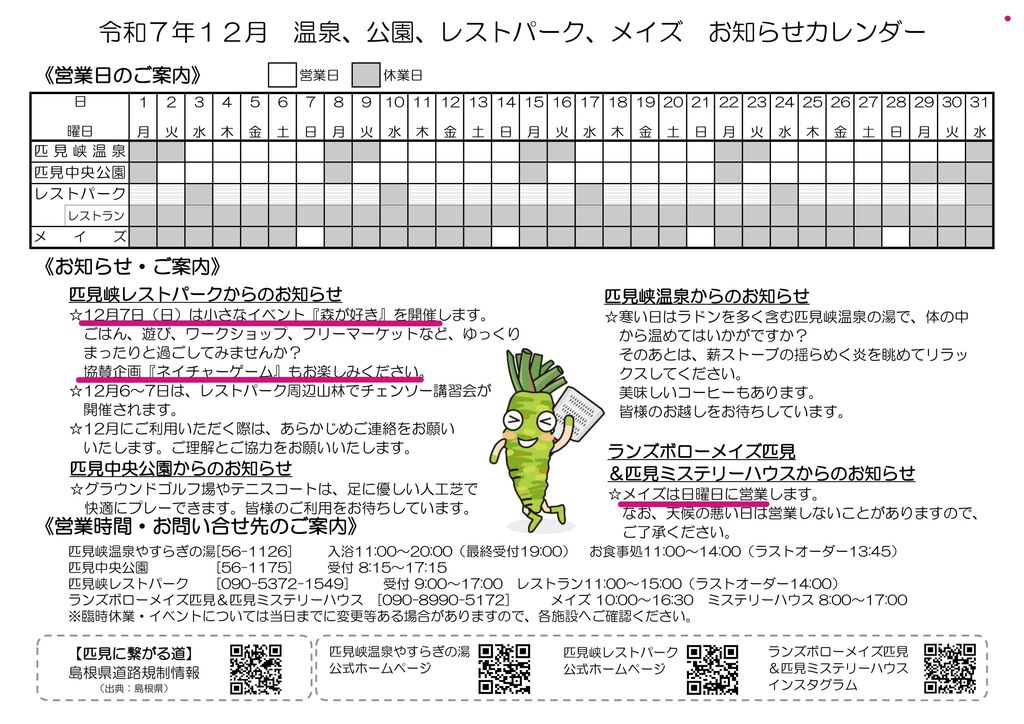 メイズは日曜日に営業。温泉・公園・メイズで、ゆったりと冬の匹見を満喫してください。