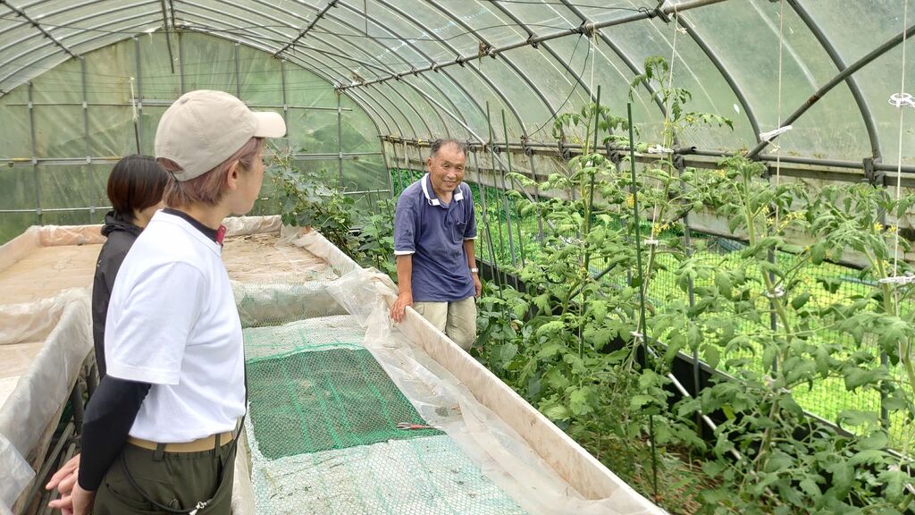 続いて、ビニールハウスや林間でわさび栽培を行っている齋藤敬さん宅を訪問。齋藤さんはわさび栽培の厳しさや工夫を丁寧に説明し、あいにくの雨の中でも林間のわさび畑やトマトの生育の様子を案内してくださいました。